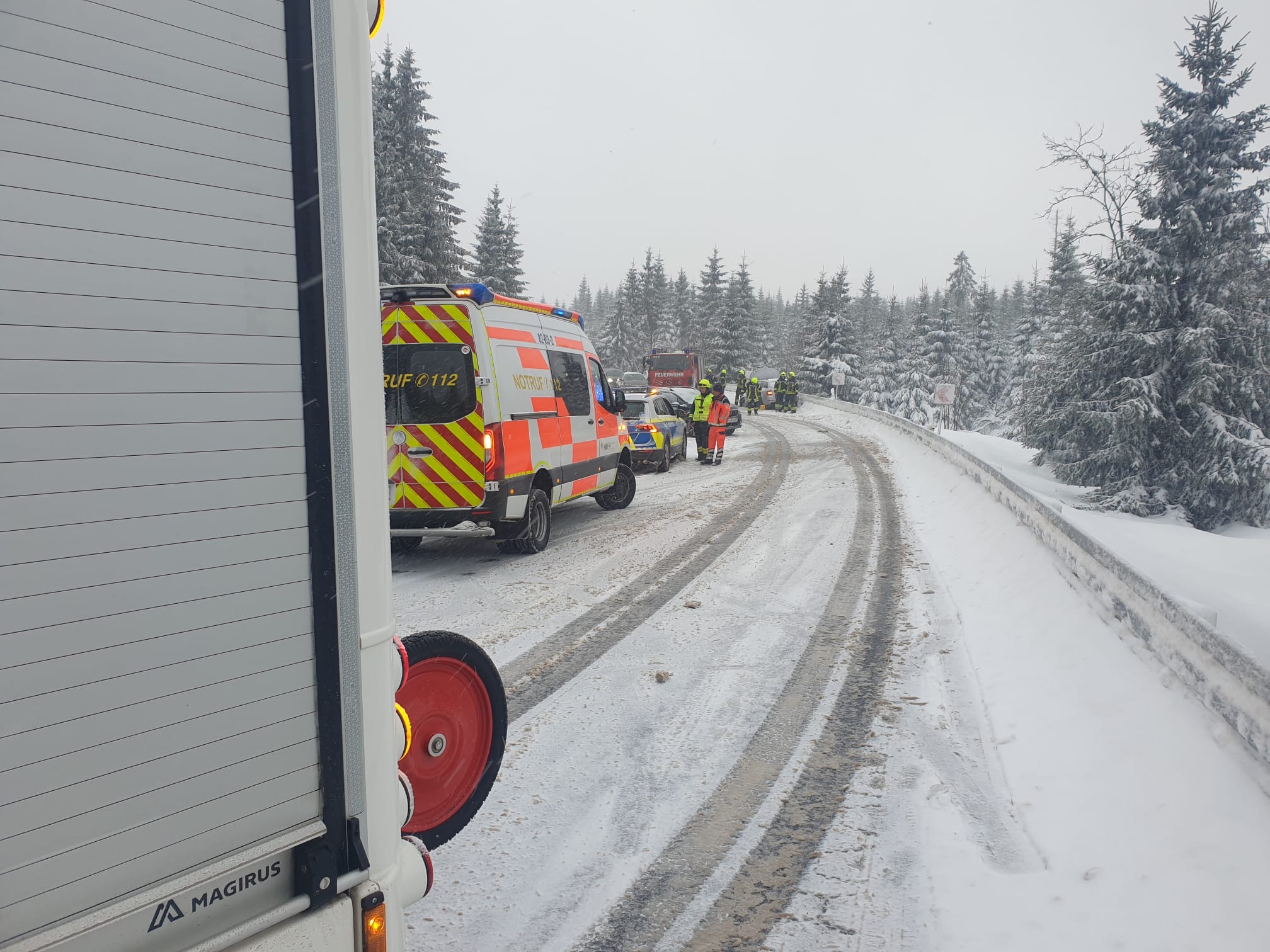 Aufgrund der Witterungsverhältnisse kam es gegen Mittag zu einem Zusammenstoß von zwei PKWs auf der Bundesstraße 242 zwischen Sonnenberg und dem Oderteich. Glücklicherweise wurde niemand verletzt, während die Fahrzeuge stark beschädigt wurden.