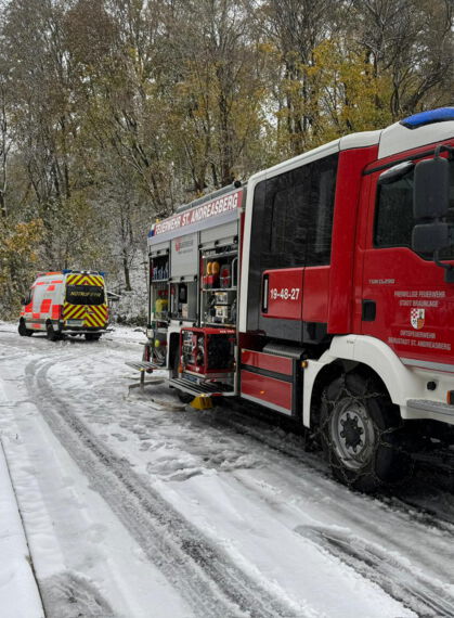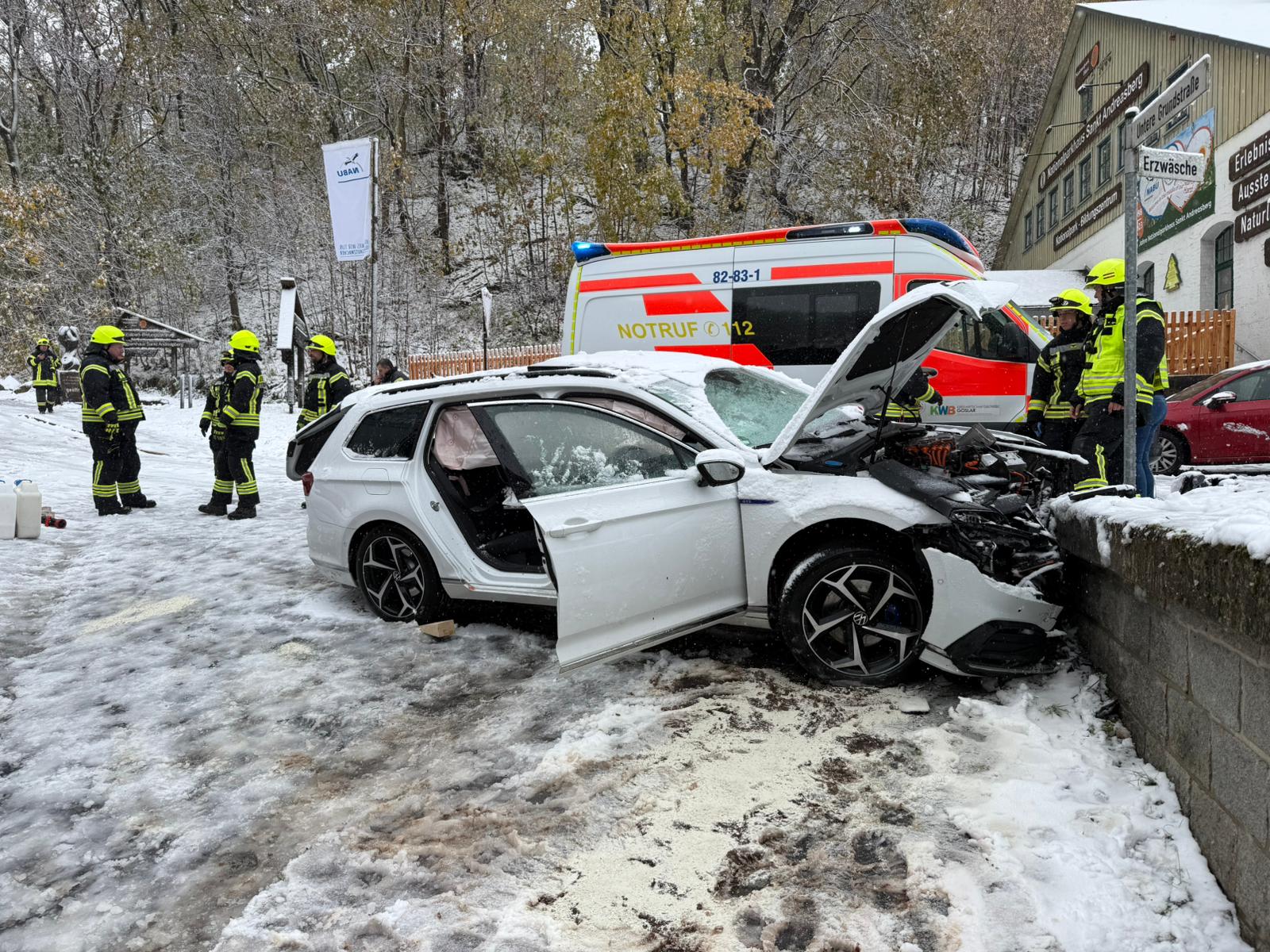 Ein PKW ist durch den plötzlichen und starken Schneefalls von der Fahrbahn abgekommen und ungebremst frontal gegen eine Stützmauer gerutscht. Die vier Insassen erlitten teils schwere Verletzungen. Ein Insasse musste aufgrund des Verletzungsmusters durch eine technische Rettung mit hydraulischem Rettungsgerät aus dem Fahrzeug gerettet werden. Weiterhin wurde das Fahrzeug gegen weiteres wegrutschen und wegrollen gesichert sowie der Brandschutz sichergestellt. Die Patienten wurden bis zum Eintreffen des Rettungsdienstes von der Feuerwehr versorgt und betreut.