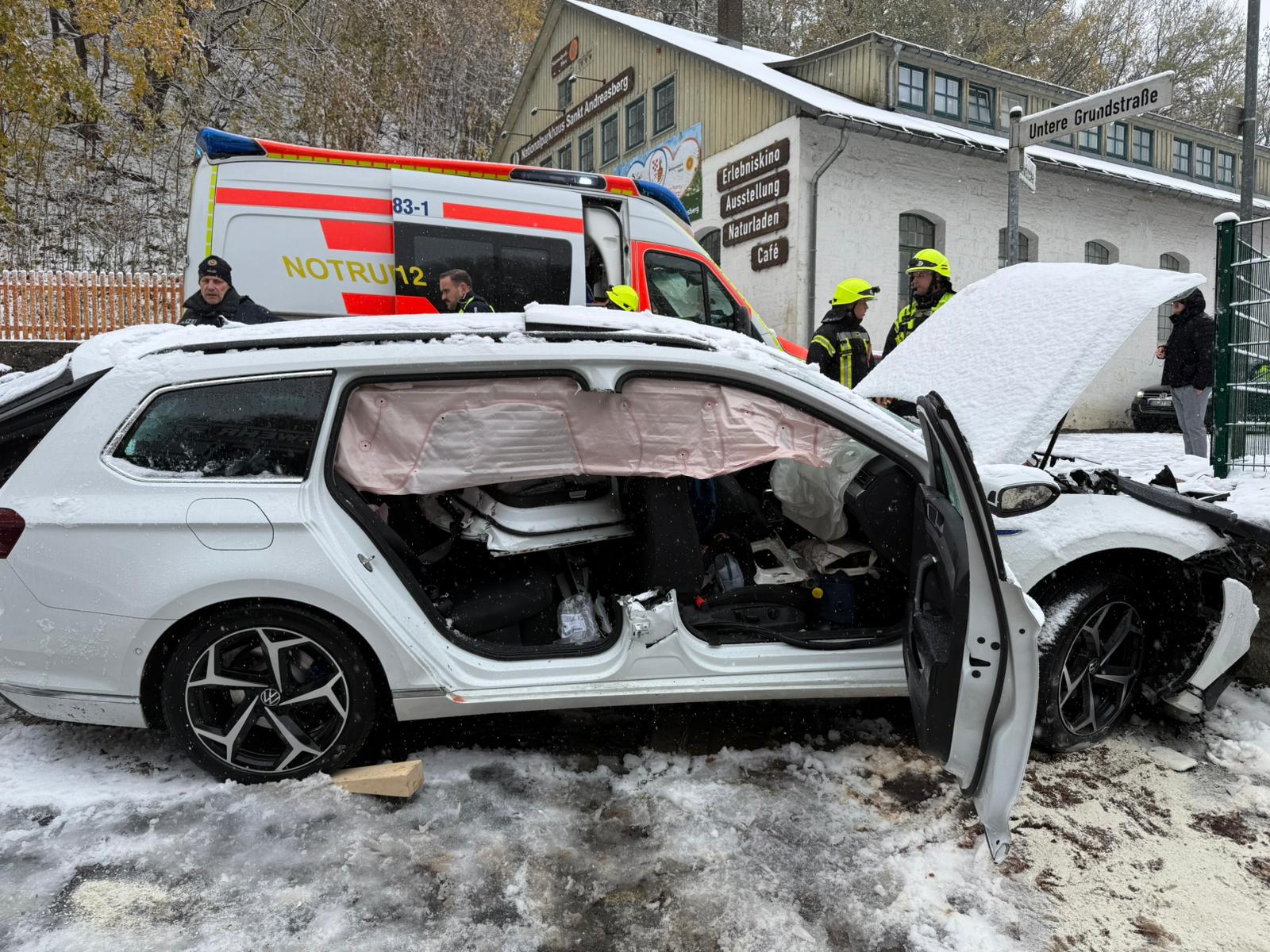 Ein PKW ist durch den plötzlichen und starken Schneefalls von der Fahrbahn abgekommen und ungebremst frontal gegen eine Stützmauer gerutscht. Die vier Insassen erlitten teils schwere Verletzungen. Ein Insasse musste aufgrund des Verletzungsmusters durch eine technische Rettung mit hydraulischem Rettungsgerät aus dem Fahrzeug gerettet werden. Weiterhin wurde das Fahrzeug gegen weiteres wegrutschen und wegrollen gesichert sowie der Brandschutz sichergestellt. Die Patienten wurden bis zum Eintreffen des Rettungsdienstes von der Feuerwehr versorgt und betreut.